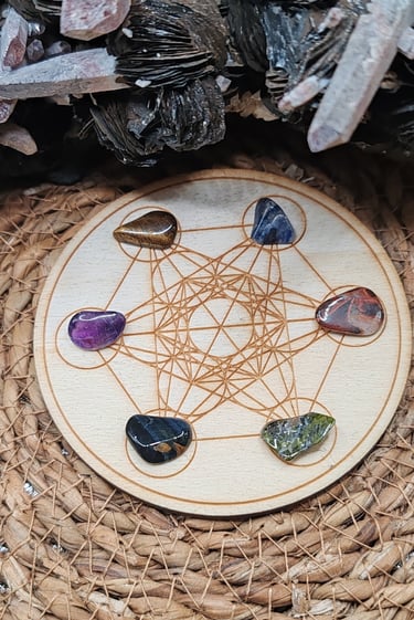 Placement des Cristaux : Disposez vos cristaux à l'intérieur du Cube de Métatron ou sur ses lignes, en les plaçant délicatement sur les différentes sphères du Cube. Visualisez l'énergie du Cube de Métatron se diffusant à travers les cristaux.