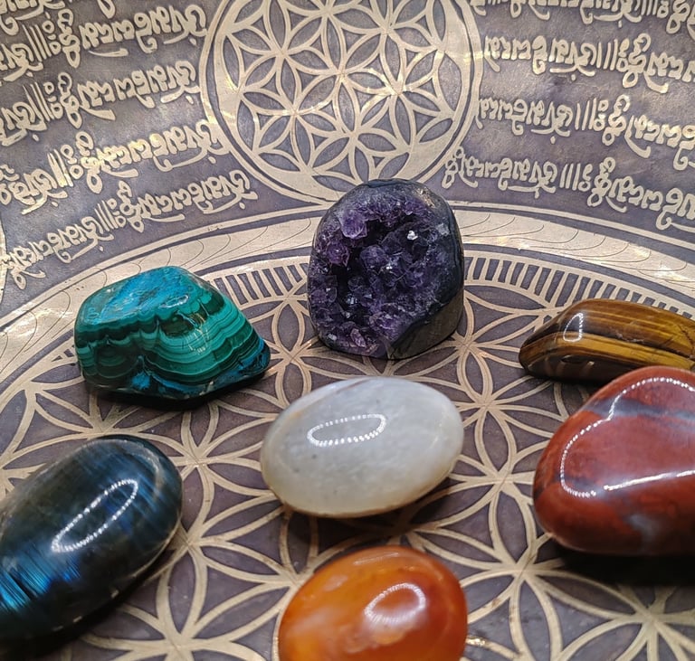 Placement des Cristaux : Disposez les cristaux que vous souhaitez recharger sur le motif de la Fleur de Vie. Cela peut être sous la forme d'une représentation imprimée, d'un objet sculpté ou d'un diagramme tracé.